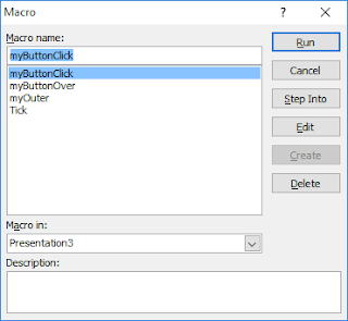 ActivePresentation.Slides(1) when I refer to the path of the shape. You can change the number if your shape is on a different slide. Once you create your shape in the Selection Pane rename your object to myButton or something else that you can remember easily later.